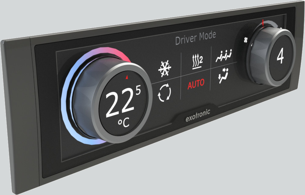 Für einen potenziellen Entwicklungsauftrag haben wir im Jahr 2017 für einen Bushersteller unterschiedliche Designentwürfe für ein Klimabedienteil (HVAC HMI) entworfen. Bei dem hier dargestellten Konzept ist das monochrome Display innerhalb des Drehknopfes angeordnet.